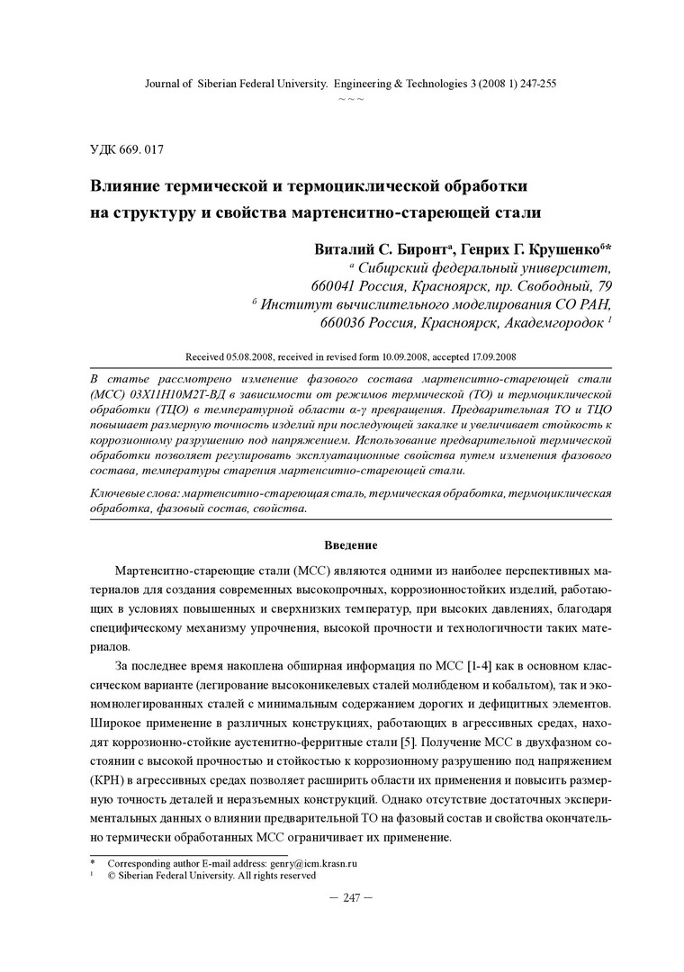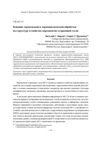 Библиографическое описание:Биронт, Виталий С... Влияние термической и термоциклической обработки на структуру и свойства мартенситно-стареющей стали = Effect of Heat and Thermo-Cyclic Treatment on Structure and Properties of Martensitic-Ageing Steel / В. С. Биронт, Г. Г. Крушенко. - Текст : непосредственный // Журнал Сибирского федерального университета. Техника и технологии. - 2008. - Т. 1, № 3. - С. 247-255. - Библиогр.: с. 254-255. - ISSN 1999-494X.