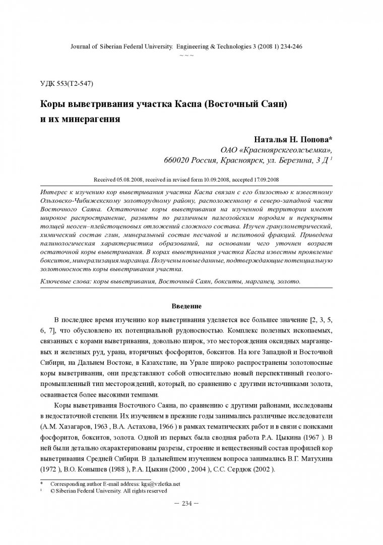 Библиографическое описание: Попова, Наталья Н... Коры выветривания участка Каспа (Восточный Саян) и их минерагения = Residual Soils of the Kasp Area (The Eastern Sayany) and their Minerageny / Н. Н. Попова. - Текст : непосредственный // Журнал Сибирского федерального университета. Техника и технологии. - 2008. - Т. 1, № 3. - С. 234-246. - Библиогр.: с. 245-246. - ISSN 1999-494X.