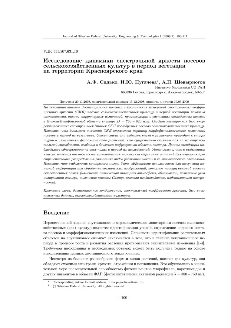 Исследование динамики спектральной яркости посевов сельскохозяйственных культур в период вегетации на территории Красноярского краястатья из журнала
