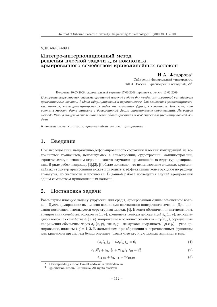 Библиографическое описание:Федорова, Н. А. Интегро-интерполяционный метод решения плоской задачи для композита, армированного семейством криволинейных волокон = Integro-Interpolational Method of Plane Problem Solving for Reinforced by Family of Curvelinear Fibers Composite / Н. А. Федорова. - Текст : непосредственный // Журнал Сибирского федерального университета. Техника и технологии. - 2009. - Т. 2, № 1. - С. 112-120. - Библиогр.: с. 120. - ISSN 1999-494X.