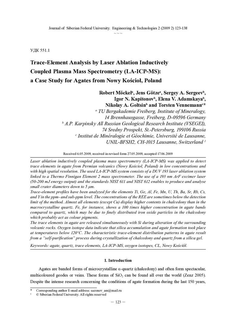 Библиографическое описание: Trace-Element Analysis by Laser Ablation Inductively Coupled Plasma Mass Spectrometry (LA-ICP-MS): a Case Study for Agates from Nowy Kościoł, Poland = Анализ микроэлементов методом лазерной абляции масс-спектрометрия с индуктивно связанной плазмой (LA-ICP-MS): Тематическое исследование агатов из Новы-Костюла, Польша / R. Mockel, J. Götze, S. A. Sergeev [et al.]. - Текст : непосредственный // Журнал Сибирского федерального университета. Техника и технологии. - 2009. - Т. 2, № 2. - С. 123-138. - Библиогр.: с. 136-138. - ISSN 1999-494X.