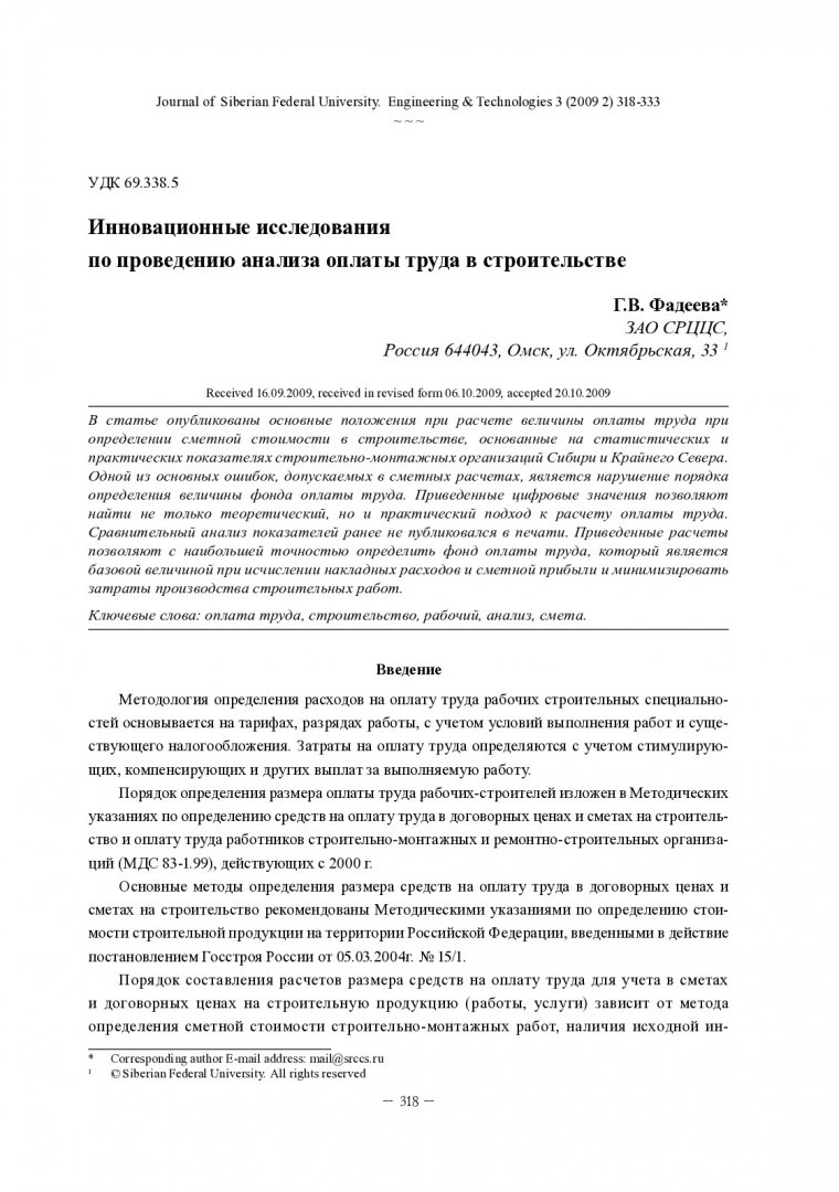 Библиографическое описание: Фадеева, Г. В. Инновационные исследования по проведению анализа оплаты труда в строительстве = Innovative Researches on Carrying Out of the Analysis of a Payment in Building / Г. В. Фадеева. - Текст : непосредственный // Журнал Сибирского федерального университета. Техника и технологии. - 2009. - Т. 2, № 3. - С. 318-333. - Библиогр.: с. 333. - ISSN 1999-494X.