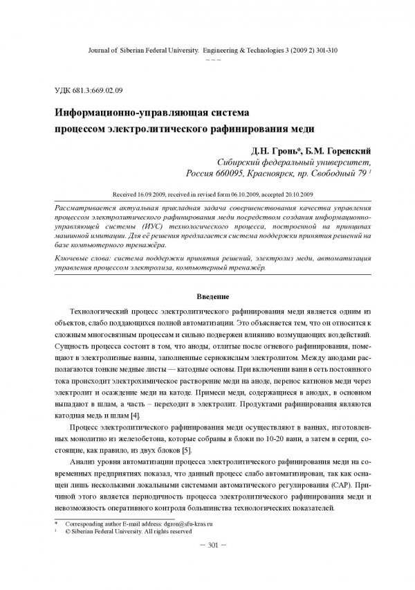 Библиографическое описание:Гронь, Д. Н. Информационно-управляющая система процессом электролитического рафинирования меди = Information-operating System Process of Electrolytic Refinement of Copper / Д. Н. Гронь, Б. М. Горенский. - Текст : непосредственный // Журнал Сибирского федерального университета. Техника и технологии. - 2009. - Т. 2, № 3. - С. 301-310. - Библиогр.: с. 309-310. - ISSN 1999-494X.