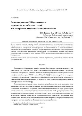 Библиографическое описание:Иванов, В. В. Синтез порошков CdO разложением термически нестабильных солей для материалов разрывных электроконтактов = The CdO Powders Synthesis by a Thermal Decomposition of Unstable Salts for Arcing Electro Contact Materials / В. В. Иванов, А. А. Шубин, Л. А. Иртюго. - Текст : непосредственный // Журнал Сибирского федерального университета. Техника и технологии. - 2009. - Т. 2, № 4. - С. 409-417. - Библиогр.: с. 416-417. - ISSN 1999-494X.