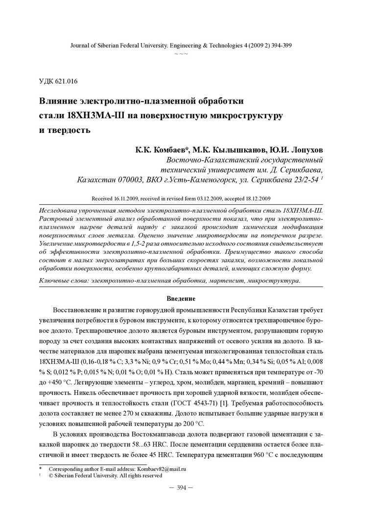 Библиографическое описание: Комбаев, К. К. Влияние электролитно-плазменной обработки стали 18ХН3МА-Ш на поверхностную микроструктуру и твердость = Influence of 18CN3MA-Sh Steel Electrolyte-Plasma Processing on Surface Microstructure and Hardness / К. К. Комбаев, М. К. Кылышканов, Ю. И. Лопухов. - Текст : непосредственный // Журнал Сибирского федерального университета. Техника и технологии. - 2009. - Т. 2, № 4. - С. 394-399. - Библиогр.: с. 399. - ISSN 1999-494X.