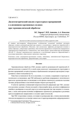 Аннотация:В статье рассмотрены обнаруженные особенности изменений линейных размеров образцов сплавов алюминий-кремний при нагреве и охлаждении в процессах термической и термоциклической обработки. Показано, что аномальные эффекты расширения-сжатия в литых образцах, содержащих эвтектику, обусловлены нарушением сплошности непрерывного эвтектического бикристалла. Установлено, что этот процесс происходит при температуре 410-420 ºС. Деление эвтектического кристалла и последующие процессы сфероидизации и коагуляции приводят к образованию зернистых структур.