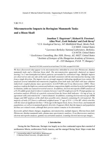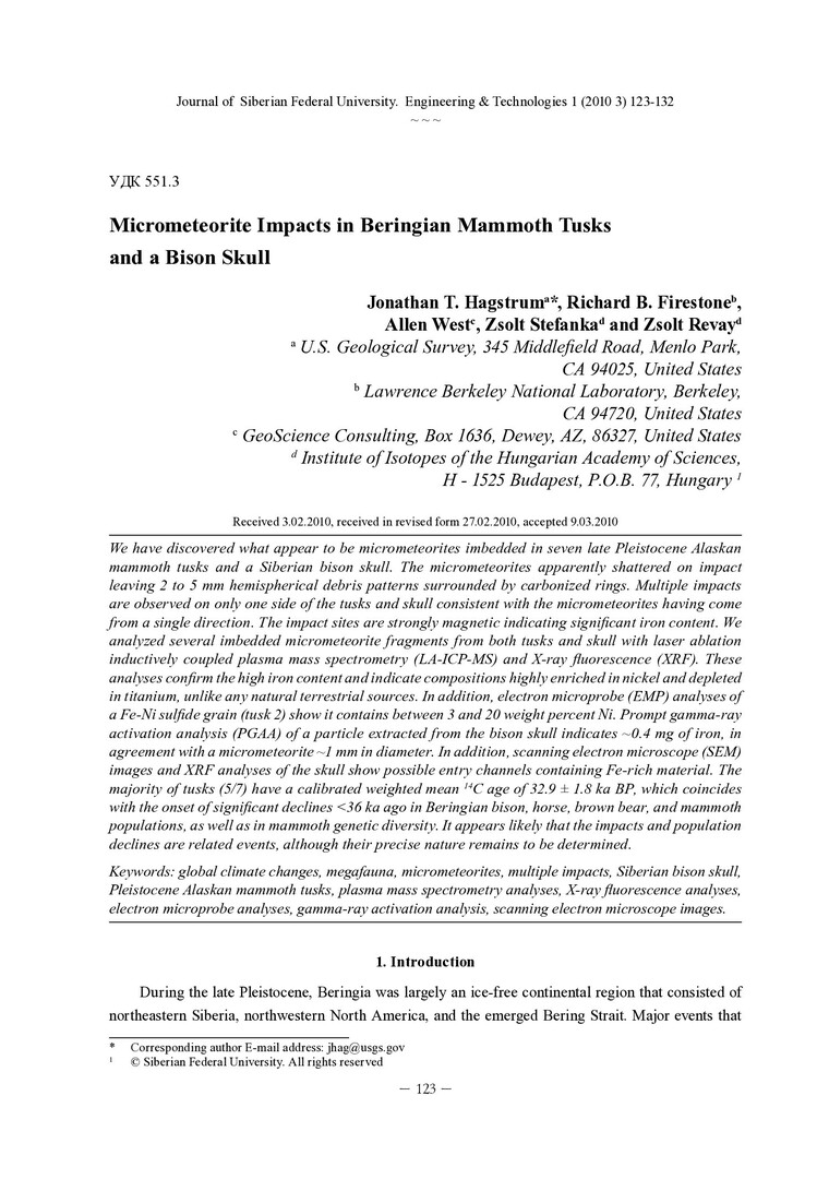 Библиографическое описание: Micrometeorite Impacts in Beringian Mammoth Tusks and a Bison Skull = Следы микрометеоритных ударов в бивнях мамонтов и черепе бизона / J. T. Hagstrum, R. B. Firestone, A. West [et al.]. - Текст : непосредственный // Журнал Сибирского федерального университета. Техника и технологии. - 2010. - Т. 3, № 1. - С. 123-132. - Библиогр.: с. 130-131. - ISSN 1999-494X.