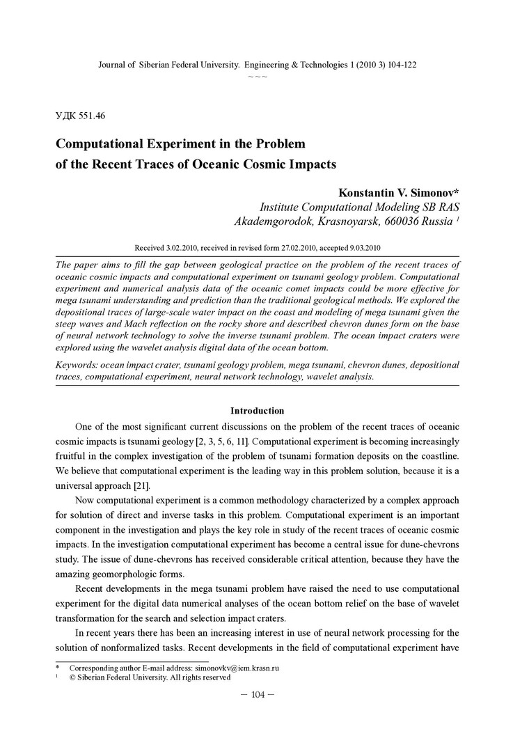 Аннотация: Статья призвана заполнить пробел между геологическими изысканиями по проблеме недавних следов космических океанских воздействий и возможностями вычислительного эксперимента по проблеме геологических следов цунами. Вычислительный эксперимент и численный анализ данных о последствиях воздействий комет на океан могут быть более эффективными для понимания и прогнозирования мегацунами, чем традиционные геологические методы. Мы анализировали следы отложений от крупномасштабных воздействий воды на побережье и моделирование мегацунами с учетом крутизны волны и отражения Маха на скалистом берегу, а также описание формы дюн-шевронов на основе нейросетевой технологии для решения обратной задачи цунами. Импактные кратеры в океане были изучены с использованием вейвлет-анализа цифровых данных океанского дна.