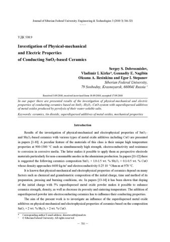Библиографическое описание:Investigation of Physical-mechanical and Electric Properties of Conducting SnO2-based Ceramics = Исследование физико-механических и электрических свойств электропроводящей керамики на основе диоксида олова / S. S. Dobrosmislov, V. I. Kirko, G. E. Nagibin [et al.]. - Текст : непосредственный // Журнал Сибирского федерального университета. Техника и технологии. - 2010. - Т. 3, № 3. - С. 316-321. - Библиогр.: с. 320-321. - ISSN 1999-494X.