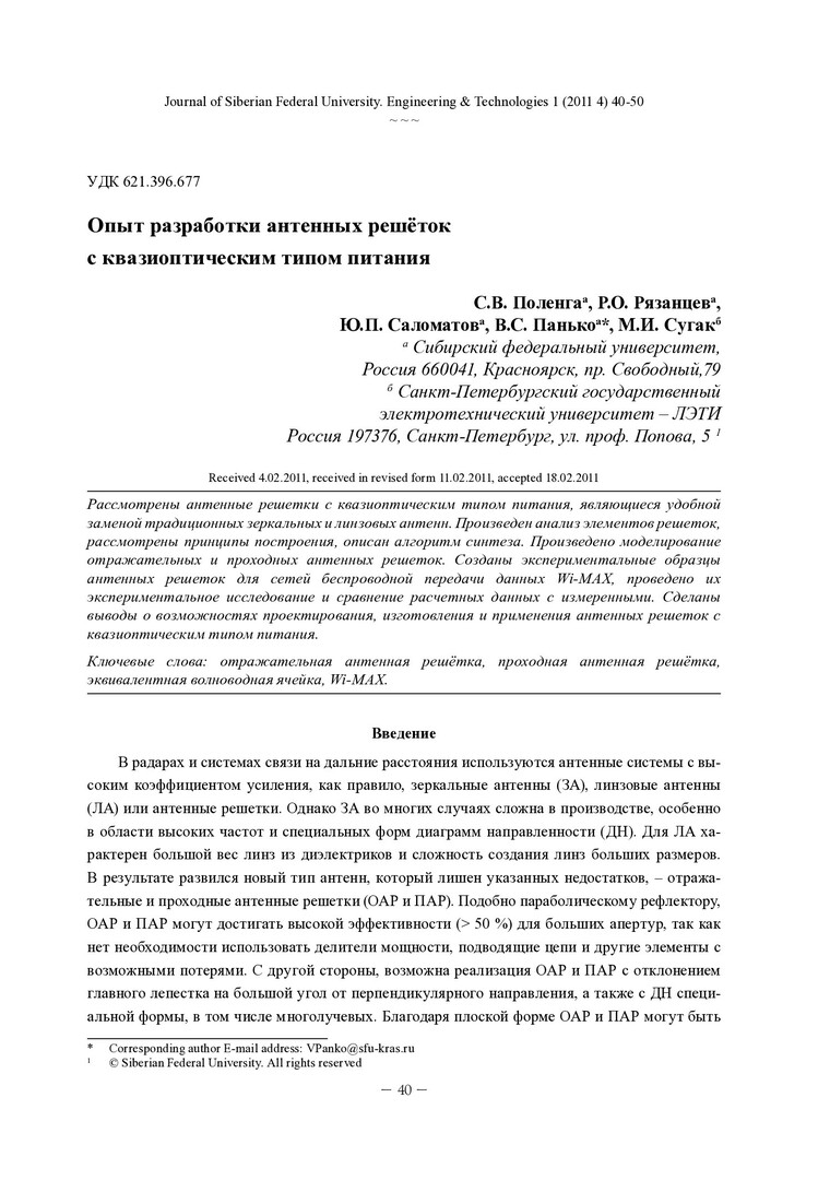 Библиографическое описание: Опыт разработки антенных решёток с квазиоптическим типом питания = Reflectarray and Transmitarray Development Experience / С. В. Поленга, Р. О. Рязанцев, Ю. П. Саломатов [и др.]. - Текст : непосредственный // Журнал Сибирского федерального университета. Техника и технологии. - 2011. - Т. 4, № 1. - С. 40-50. - Библиогр.: с. 49. - ISSN 1999-494X.