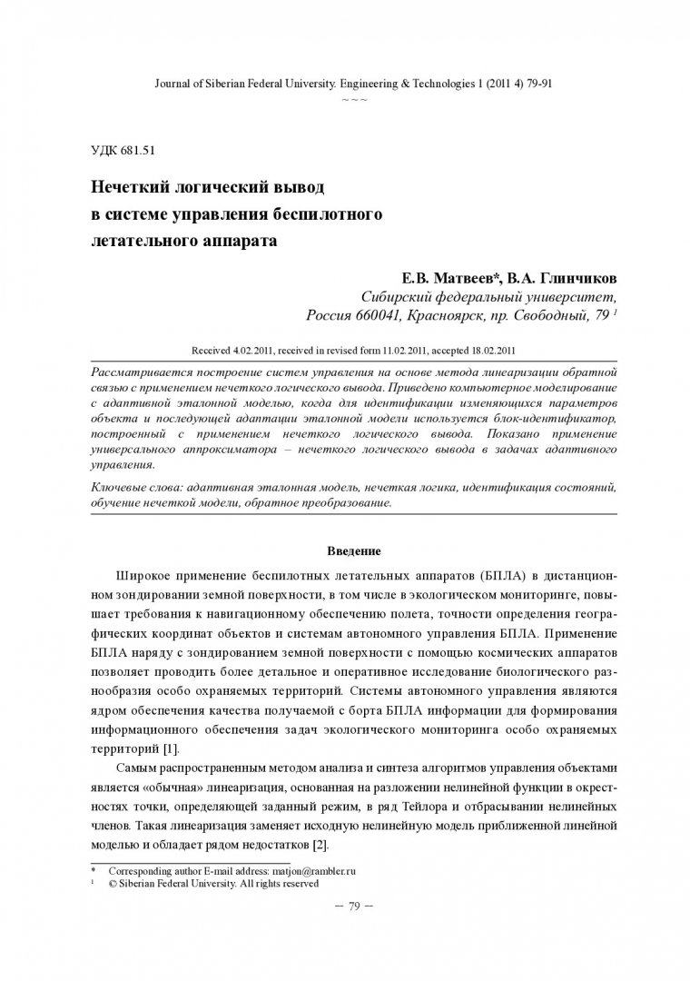 Библиографическое описание:Матвеев, Е. В. Нечеткий логический вывод в системе управления беспилотного летательного аппарата = Fuzzy Logic Conclusion in the Control System UAV / Е. В. Матвеев, В. А. Глинчиков. - Текст : непосредственный // Журнал Сибирского федерального университета. Техника и технологии. - 2011. - Т. 4, № 1. - С. 79-91. - Библиогр.: с. 90-91. - ISSN 1999-494X.