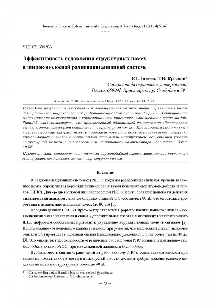 Библиографическое описание: Галеев, Р. Г. Эффективность подавления структурных помех в широкополосной радионавигационной системе = Efficiency of Rejection of Adjacent-Channel Interference in the Wideband Radionavigation System / Р. Г. Галеев, Т. В. Краснов. - Текст : непосредственный // Журнал Сибирского федерального университета. Техника и технологии. - 2011. - Т. 4, № 1. - С. 58-67. - Библиогр.: с. 67. - ISSN 1999-494X.