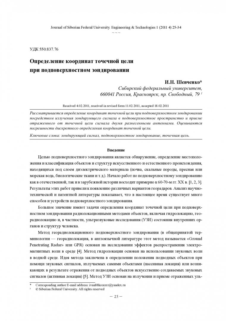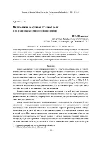 Библиографическое описание:Шевченко, И. Н. Определение координат точечной цели при подповерхностном зондировании = Determination of Coordinates of the Point Target at Subsurface Sounding / И. Н. Шевченко. - Текст : непосредственный // Журнал Сибирского федерального университета. Техника и технологии. - 2011. - Т. 4, № 1. - С. 25-34. - Библиогр.: с. 33. - ISSN 1999-494X.