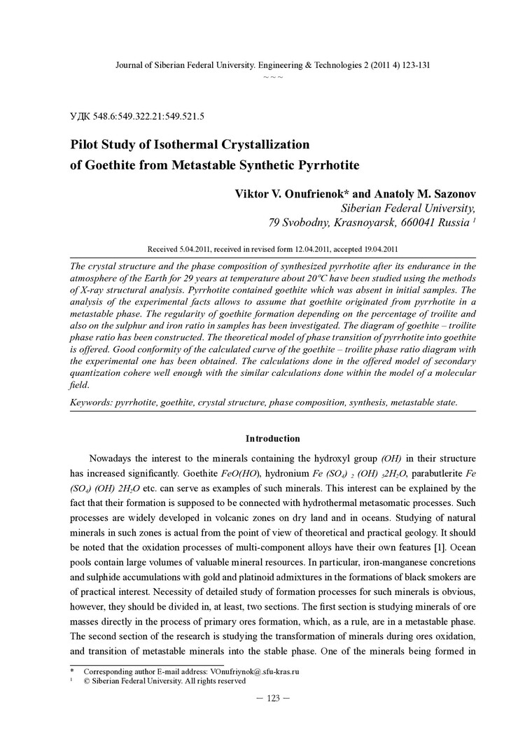 Библиографическое описание: Onufrienok, Viktor V... Pilot Study of Isothermal Crystallization of Goethite from Metastable Synthetic Pyrrhotite = Экспериментальные исследования изотермического образования гетита из метастабильного синтетического пирротина / V. V. Onufrienok, A. M. Sazonov. - Текст : непосредственный // Журнал Сибирского федерального университета. Техника и технологии. - 2011. - Т. 4, № 2. - С. 123-131. - Библиогр.: с. 130-131. - ISSN 1999-494X.