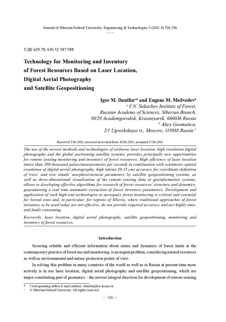 Библиографическое описание: Danilin, Igor M... Technology for Monitoring and Inventory of Forest Resources Based on Laser Location, Digital Aerial Photography and Satellite Geopositioning = Технология мониторинга и инвентаризации лесных ресурсов на основе лазерной локации, цифровой аэрофотосъемки и спутникового геопозиционирования / I. M. Danilin, E. M. Medvedev. - Текст : непосредственный // Журнал Сибирского федерального университета. Техника и технологии. - 2011. - Т. 4, № 3. - С. 326-336. - Библиогр.: с. 334-335. - ISSN 1999-494X.
