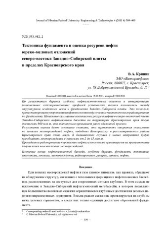 Библиографическое описание: Кринин, В. А. Тектоника фундамента и оценка ресурсов нефти юрско-меловых отложений северо-востока Западно-Сибирской плиты в пределах Красноярского края = Basement Tectonics and Oil Resources Estimation Referred to Jurassic-Cretaceous Deposits of Northern-Eastern Part of West-Siberian Plate Within Krasnoyarsk Region / В. А. Кринин. - Текст : непосредственный // Журнал Сибирского федерального университета. Техника и технологии. - 2011. - Т. 4, № 4. - С. 399-409. - Библиогр.: с. 408. - ISSN 1999-494X.