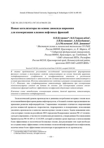 Библиографическое описание: Новые катализаторы на основе диоксида циркония для изомеризации алканов нефтяных фракций = Novel Zirconia Based Catalysts for the Isomerization of Alkanes of Petroleum Fractions / П. Н. Кузнецов, В. П. Твердохлебов, Л. И. Кузнецова [и др.]. - Текст : непосредственный // Журнал Сибирского федерального университета. Техника и технологии. - 2011. - Т. 4, № 4. - С. 438-452. - Библиогр.: с. 449-451. - ISSN 1999-494X.