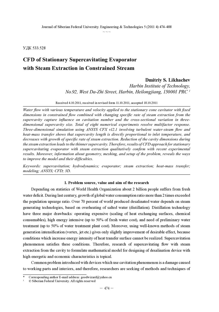 Библиографическое описание: Likhachev, Dmitriy S... CFD of Stationary Supercavitating Evaporator with Steam Extraction in Constrained Stream = Моделирование суперкавитационного испарителя с отбором пара в ограниченном потоке / D. S. Likhachev. - Текст : непосредственный // Журнал Сибирского федерального университета. Техника и технологии. - 2011. - Т. 4, № 5. - С. 474-488. - Библиогр. в конце ст. - ISSN 1999-494X.