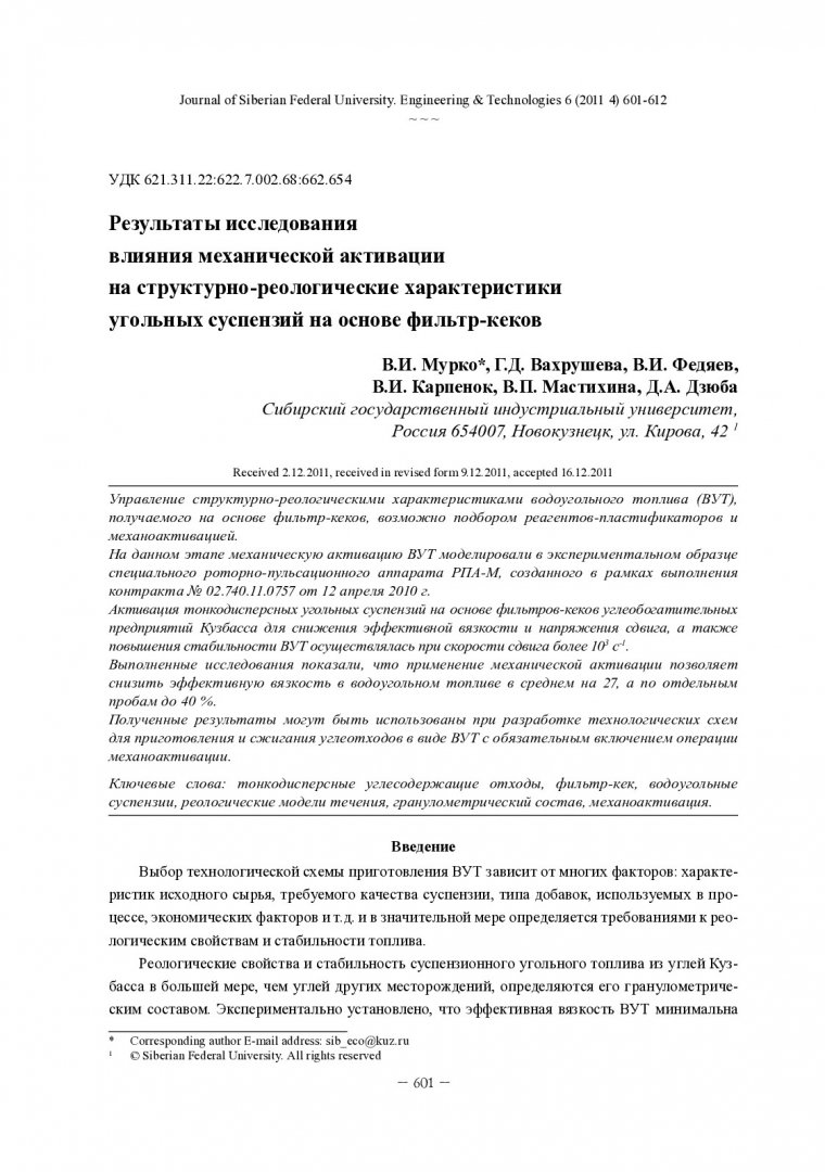 Библиографическое описание: Результаты исследования влияния механической активации на структурно-реологические характеристики угольных суспензий на основе фильтр-кеков = Results of Research of Influence of Mechanical Activation on Structurally-Rheological Characteristics of Coal Suspensions on the Basis the Filter-Cake / В. И. Мурко, Г. Д. Вахрушева, В. И. Федяев [и др.]. - Текст : непосредственный // Журнал Сибирского федерального университета. Техника и технологии. - 2011. - Т. 4, № 6. - С. 601-612. - Библиогр. в конце ст. - ISSN 1999-494X.