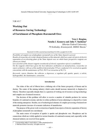 Библиографическое описание: Bragina, Vera I... Working Out of Resource-Saving Technology of Enrichment of Phosphate-Raremetall Ores = Разработка ресурсосберегающей технологии обогащения фосфатно-редкометалльных руд / V. I. Bragina, N. I. Konnova, J. V. Sushkina. - Текст : непосредственный // Журнал Сибирского федерального университета. Техника и технологии. - 2011. - Т. 4, № 6. - С. 685-695. - Библиогр. в конце ст. - ISSN 1999-494X.