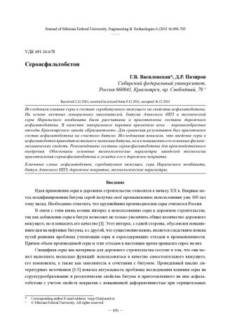 Библиографическое описание: Василовская, Г. В. Сероасфальтобетон = Sulfur Asphaltconcreet / Г. В. Василовская, Д. Р. Назиров. - Текст : непосредственный // Журнал Сибирского федерального университета. Техника и технологии. - 2011. - Т. 4, № 6. - С. 696-703. - Библиогр. в конце ст. - ISSN 1999-494X.