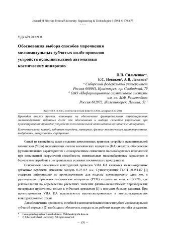 Аннотация:Приведен анализ причин, влияющих на обеспечение функциональных характеристик мелкомодульных зубчатых колёс для обоснования и выбора способов упрочнения при проектировании приводов устройств исполнительной автоматики космических аппаратов.