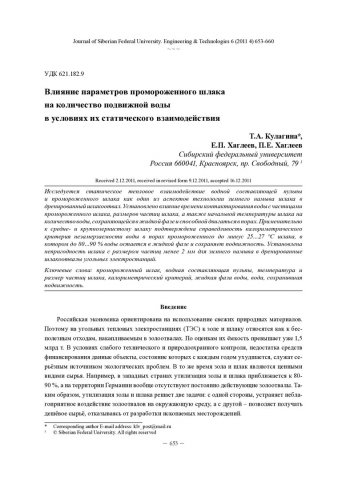 Библиографическое описание: Кулагина, Т. А. Влияние параметров промороженного шлака на количество подвижной воды в условиях их статического взаимодействия = Impact of Freezing Slag Parameters on Mobile Water Quantity with Their Static Interaction / Т. А. Кулагина, Е. П. Хаглеев, П. Е. Хаглеев. - Текст : непосредственный // Журнал Сибирского федерального университета. Техника и технологии. - 2011. - Т. 4, № 6. - С. 653-660. - Библиогр. в конце ст. - ISSN 1999-494X.