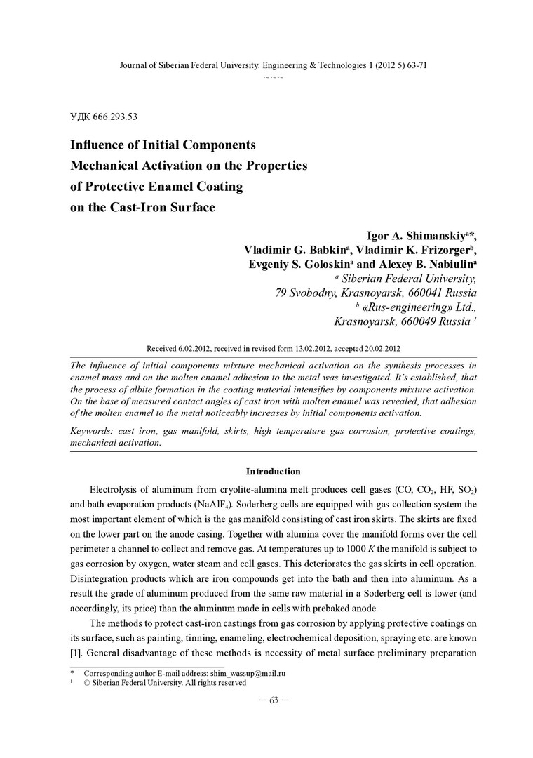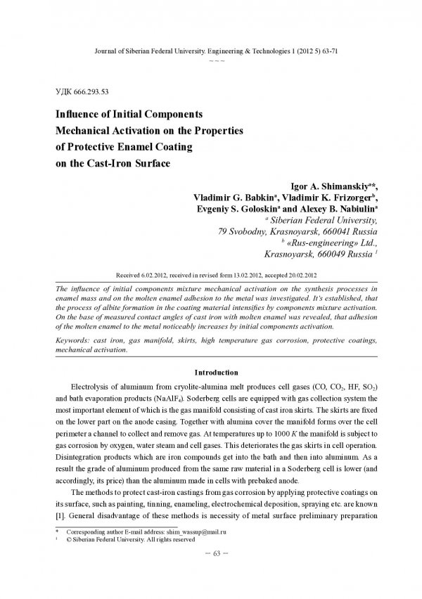 Библиографическое описание:Influence of Initial Components Mechanical Activation on the Properties of Protective Enamel Coating on the Cast-Iron Surface = Влияние механоактивации исходных компонентов на свойства защитного эмалевого покрытия на поверхности чугунных изделий / Igor A. Shimanskiy [et al.]. - Текст : непосредственный // Журнал Сибирского федерального университета. Техника и технологии. - 2012. - Т. 5, № 1. - С. 63-71 : ил. - ISSN 1999-494X.