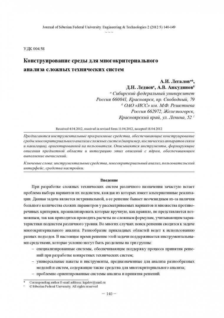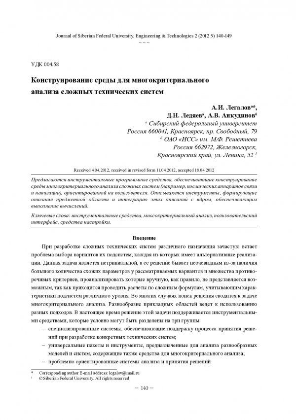 Библиографическое описание:Легалов, А. И. Конструирование среды для многокритериального анализа сложных технических систем = Design of Environment for Multicriterial Analysis of Complex Engineering Systems / А. И. Легалов, Д. Н. Ледяев, А. В. Анкудинов. - Текст : непосредственный // Журнал Сибирского федерального университета. Техника и технологии. - 2012. - Т. 5, № 2. - С. 140-149 : ил. - Библиогр.: с. 148 (4 назв.). - ISSN 1999-494X.