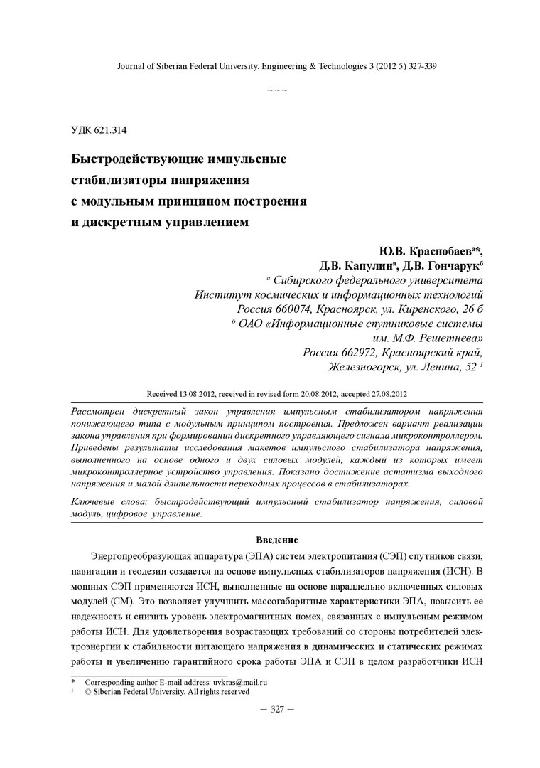 Библиографическое описание:Краснобаев, Ю. В. Быстродействующие импульсные стабилизаторы напряжения с модульным принципом построения и дискретным управлением = Quick-Switching Voltage Regulator with Modular Principle and Discrete Control / Ю. В. Краснобаев, Д. В. Капулин, Д. В. Гончарук. - Текст : непосредственный // Журнал Сибирского федерального университета. Техника и технологии. - 2012. - Т. 5, № 3. - С. 327-339 : ил. - Библиогр.: с. 339 (5 назв.). - ISSN 1999-494X.