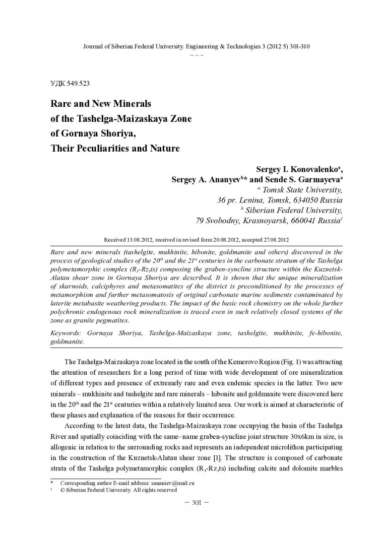 Библиографическое описание: Konovalenko, Sergey. Rare and New Minerals of the Tashelga-Maizaskaya Zone of Gornaya Shoriya, Their Peculiarities and Nature = Редкие и новые минералы ташелгино-майзаской зоны Горной Шории, их особенности и природа / S. I. Konovalenkoа, S. A. Ananyevb, S. S. Garmayevaа. - Текст : непосредственный // Журнал Сибирского федерального университета. Техника и технологии. - 2012. - Т. 5, № 3. - С. 301-310 : ил. - Библиогр.: с. 309-310 (19 назв.). - ISSN 1999-494X.