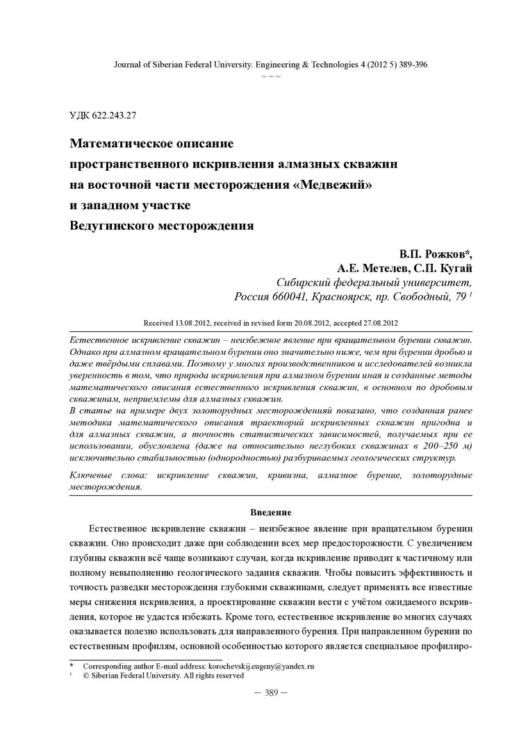 Библиографическое описание: Рожков, В. П. Математическое описание пространственного искривления алмазных скважин на восточной части месторождения «Медвежий» и западном участке Ведугинского месторождения = Mathematical Formulation of the Diamond Borehole Deviation on the Eastern Past of the Medvezhij Deposit and Western Area of the Veduginskoe Deposit / В. П. Рожков, А. Е. Метелев, С. П. Кугай. - Текст : непосредственный // Журнал Сибирского федерального университета. Техника и технологии. - 2012. - Т. 5, № 4. - С. 389-396 : ил. - Библиогр.: с. 395 (2 назв.). - ISSN 1999-494X.