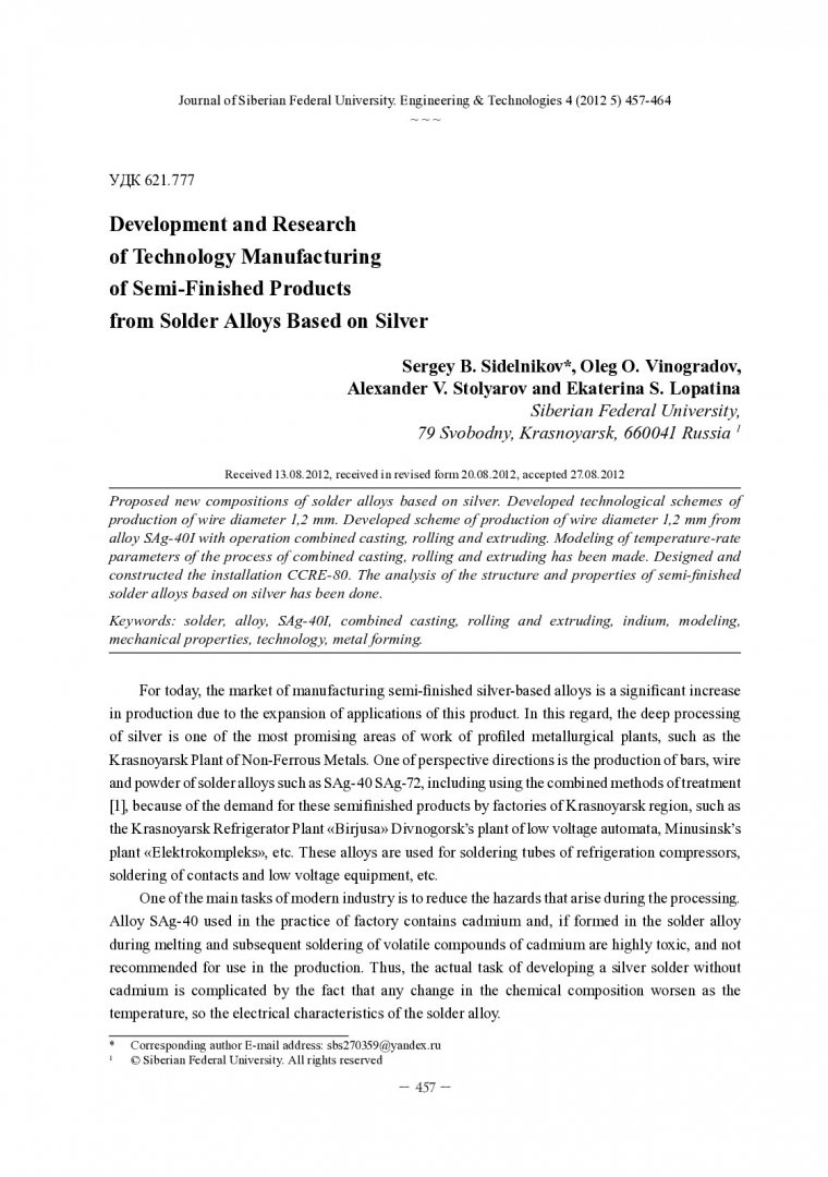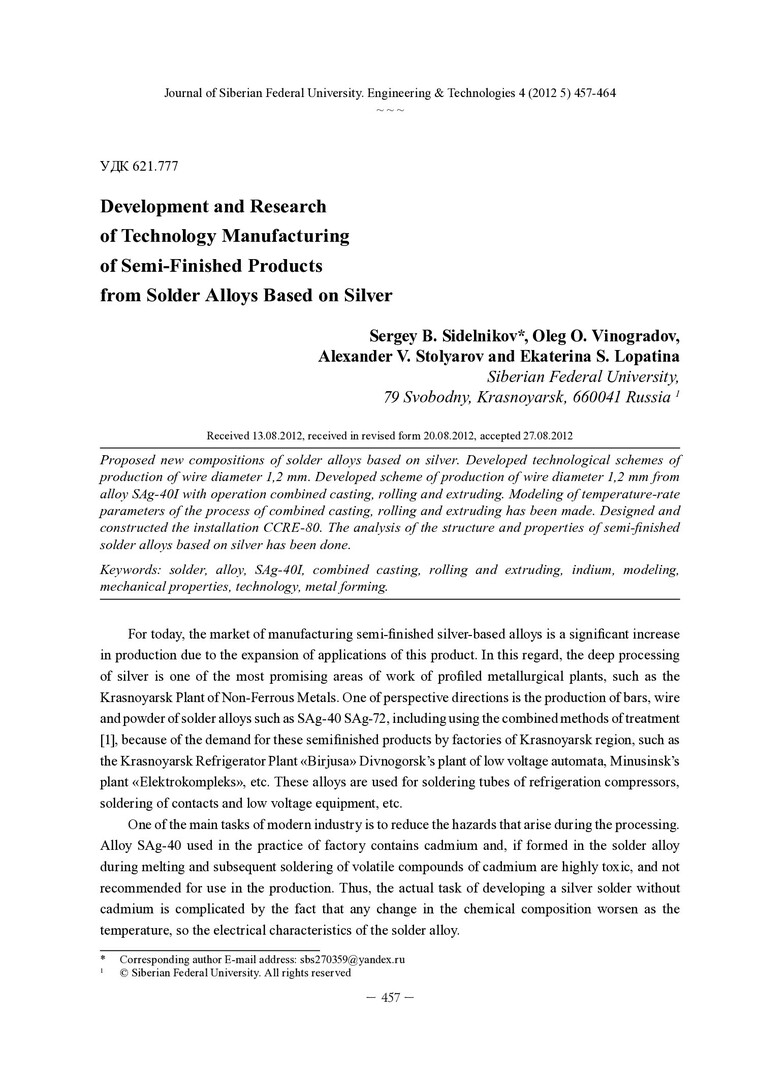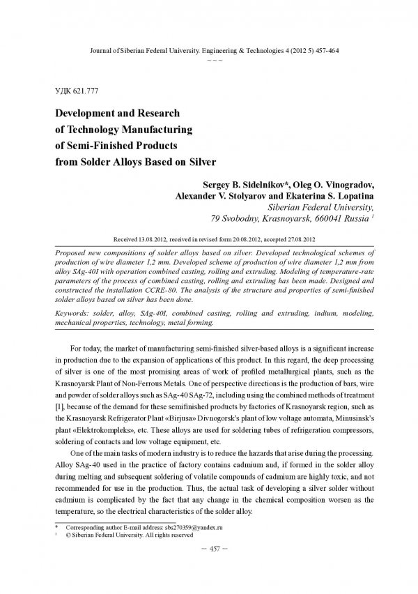 Библиографическое описание: Sidelnikov, Sergey. Development and Research of Technology Manufacturing of Semi-Finished Products from Solder Alloys Based on Silver = Разработка и исследование технологии производства деформированных полуфабрикатов из припойных сплавов на основе серебра / S. B. Sidelnikov [at all]. - Текст : непосредственный // Журнал Сибирского федерального университета. Техника и технологии. - 2012. - Т. 5, № 4. - С. 457-464 : ил. - Библиогр.: с. 464 (6 назв.). - ISSN 1999-494X.