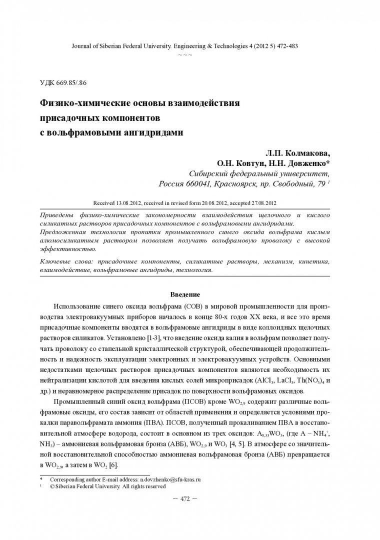 Библиографическое описание: Колмакова, Л. П. Физико-химические основы взаимодействия присадочных компонентов с вольфрамовыми ангидридами = Physicochemical Foundation of Interaction of Doped Components with Tungsten Anhydrides / Л. П. Колмакова, О. Н. Ковтун, Н. Н. Довженко. - Текст : непосредственный // Журнал Сибирского федерального университета. Техника и технологии. - 2012. - Т. 5, № 4. - С. 472-483 : ил. - Библиогр.: с. 481-482 (30 назв.). - ISSN 1999-494X.