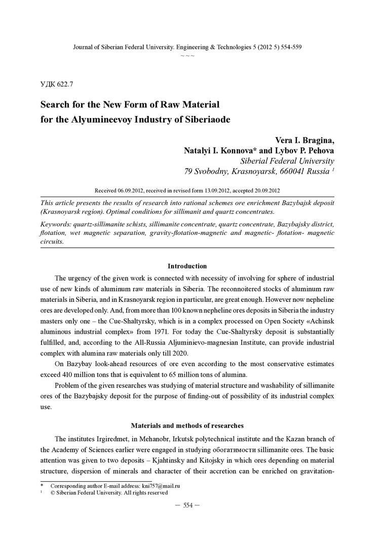 Библиографическое описание:Bragina, Vera. Search for the New Form of Raw Material for the Alyumineevoy Industry of Siberiaode = Поиск нового вида сырья для алюминиевой промышленности / V. I. Bragina, N. I. Konnova, L. P. Pehova. - Текст : непосредственный // Журнал Сибирского федерального университета. Техника и технологии. - 2012. - Т. 5, № 5. - С. 554-559 : ил. - Библиогр.: с. 559 (6 назв.). - ISSN 1999-494X.