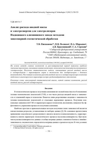 Библиографическое описание:Анализ расхода анодной массы и электроэнергии для электролизеров Надвоицкого алюминиевого завода методами многомерной статистической обработки = Anode Paste and Energy Consumptions Analysis for Nadvoitsy Aluminium Smelter Reduction Cells Using Multivariate Statistical Processing Methods / Т. В. Пискажова [и др.]. - Текст : непосредственный // Журнал Сибирского федерального университета. Техника и технологии. - 2012. - Т. 5, № 5. - С. 538-553 : ил. - Библиогр.: с. 552 (12 назв.). - ISSN 1999-494X.