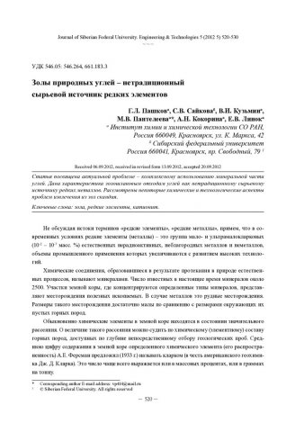 Аннотация:Статья посвящена актуальной проблеме – комплексному использованию минеральной части углей. Дана характеристика золошлаковым отходам углей как нетрадиционному сырьевому источнику редких металлов. Рассмотрены некоторые химические и технологические аспекты проблем извлечения из зол скандия.