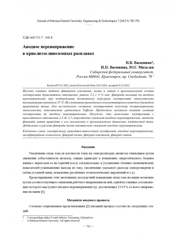 Библиографическое описание: Васюнина, Н. В. Анодное перенапряжение в криолитоглиноземных расплавах = Anodic Overvoltage in Cryolite-Alumina Melts / Н. В. Васюнина, И. П. Васюнина, Ю. Г. Михалев. - Текст : непосредственный // Журнал Сибирского федерального университета. Техника и технологии = Journal of Siberian Federal University. Engineering & Technologies. - 2012. - Т. 5, № 7. - С. 783-792 : ил., табл. - Библиогр.: с. 790-791 (13 назв.). - ISSN 1999-494X.