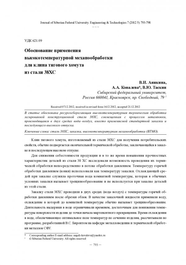 Библиографическое описание:Аникина, В. И. Обоснование применения высокотемпературной механообработки для клина тягового хомута из стали 38ХС = Justification of Application VTMO for the Wedge of the Traction Collar from Steel 38ХС / В. И. Аникина, А. А. Ковалева, В. Ю. Таскин. - Текст : непосредственный // Журнал Сибирского федерального университета. Техника и технологии = Journal of Siberian Federal University. Engineering & Technologies. - 2012. - Т. 5, № 7. - С. 793-798 : ил. - ISSN 1999-494X.