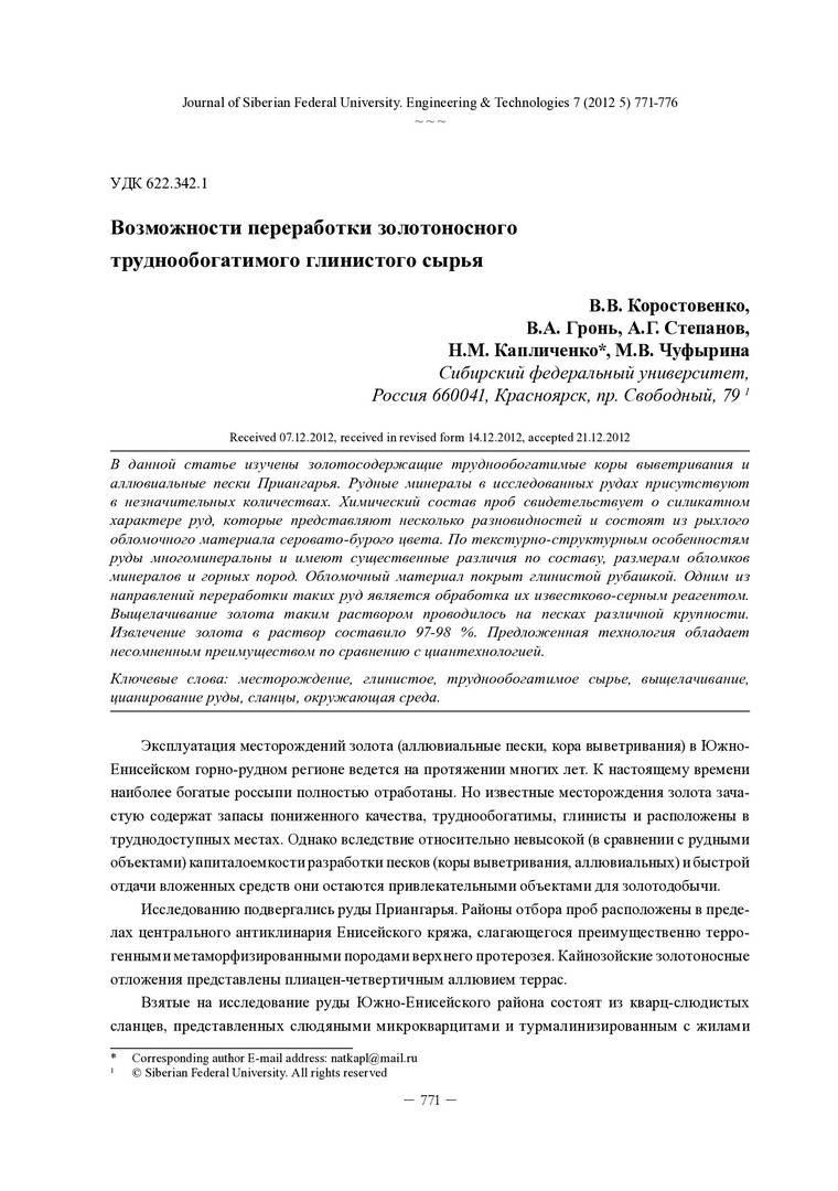 Библиографическое описание: Возможности переработки золотоносного труднообогатимого глинистого сырья = Possibility of Recycling Gold-Bearing Refractory Clay Raw Materials / В. В. Коростовенко [и др.]. - Текст : непосредственный // Журнал Сибирского федерального университета. Техника и технологии = Journal of Siberian Federal University. Engineering & Technologies. - 2012. - Т. 5, № 7. - С. 771-776 : граф. - Библиогр.: с. 775 (6 назв.). - ISSN 1999-494X.