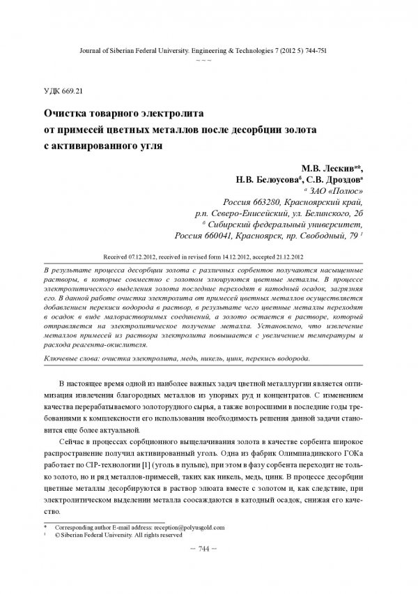 Библиографическое описание: Лескив, М. В. Очистка товарного электролита от примесей цветных металлов после десорбции золота с активированного угля = Finished Electrolyte Purification From Impurities of Non-Ferrous Metals after Desorption of Gold from Activated Carbon / М. В. Лескив, Н. В. Белоусова, С. В. Дроздов. - Текст : непосредственный // Журнал Сибирского федерального университета. Техника и технологии = Journal of Siberian Federal University. Engineering & Technologies. - 2012. - Т. 5, № 7. - С. 744-751 : табл., граф. - Библиогр.: с. 751 (5 назв.). - ISSN 1999-494X.