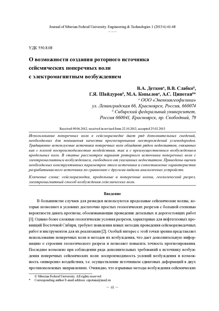 Библиографическое описание: О возможности создания роторного источника сейсмических поперечных волн с электромагнитным возбуждением = The Possibility of Creation of Rotary-Type Source of Seismic Transverse Waves with Electromagnetic Excitation / В. А. Детков [и др.]. - Текст : непосредственный // Журнал Сибирского федерального университета. Техника и технологии. - 2013. - Т. 6, № 1. - С. 61-68 : рис. - Библиогр.: с. 67. - ISSN 1999-494X.