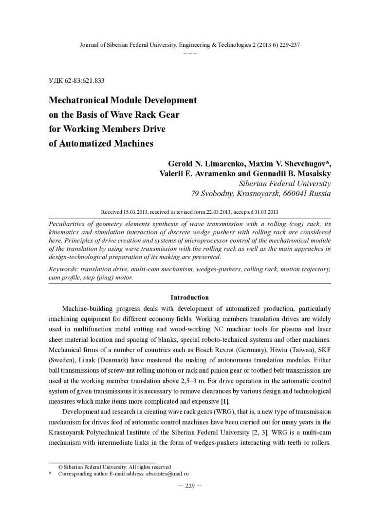 Библиографическое описание:Mechatronical Module Development on the Basis of Wave Rack Gear for Working Members Drive of Automatized Machines = Разработка мехатронного модуля на основе волновой реечной передачи для привода рабочих органов автоматизированных машин / Gerold N. Limarenko [at all]. - Текст : непосредственный // Журнал Сибирского федерального университета. Техника и технологии. - 2013. - Т. 6, № 2. - С. 229-237 : рис., табл. - Библиогр.: с. 237. - ISSN 1999-494X.