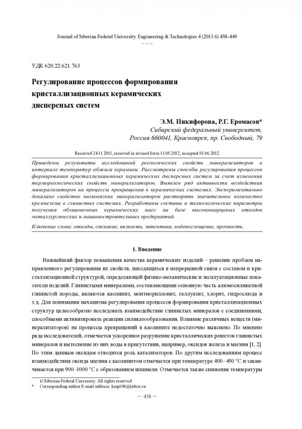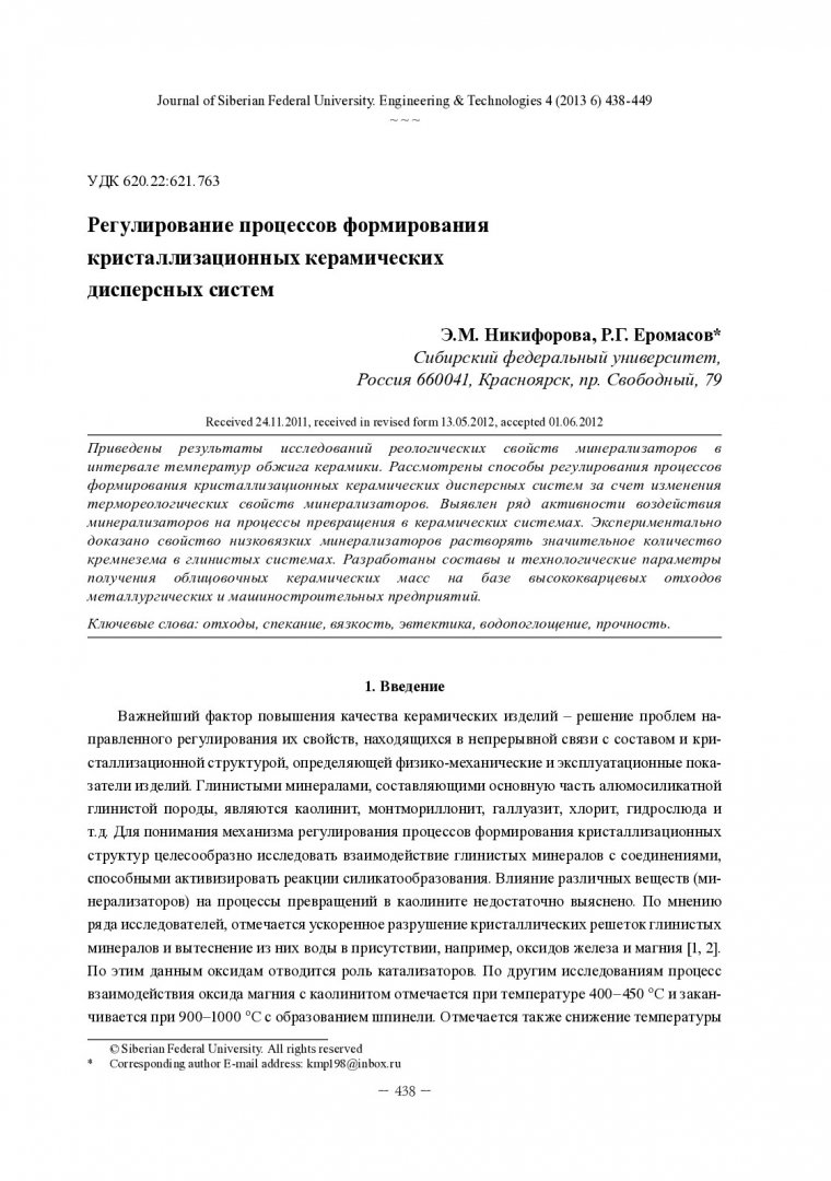 Библиографическое описание: Никифорова, Э. М. Регулирование процессов формирования кристаллизационных керамических дисперсных систем = Regulation of Processes Formation of Ceramic Crystallization Dispersed Systems / Э. М. Никифорова, Р. Г. Еромасов. - Текст : непосредственный // Журнал Сибирского федерального университета. Техника и технологии. - 2013. - Т. 6, № 4. - С. 438-449 : рис., табл. - Библиогр.: с. 449. - ISSN 1999-494X.