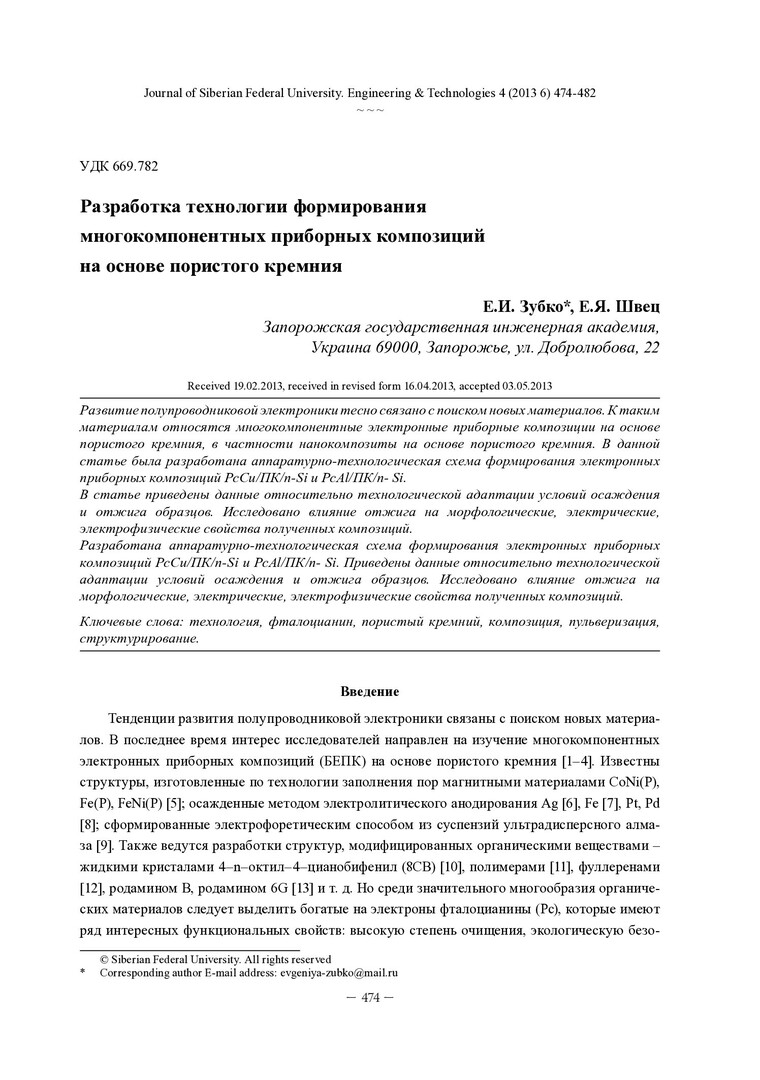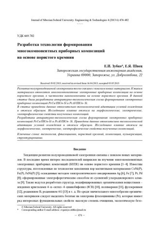 Библиографическое описание: Зубко, Е. И. Разработка технологии формирования многокомпонентных приборных композиций на основе пористого кремния = Development of Technology of Mylticomponent Instrument Composition Formation on the Basis of Porous Silicon / Е. И. Зубко, Е. Я. Швец. - Текст : непосредственный // Журнал Сибирского федерального университета. Техника и технологии. - 2013. - Т. 6, № 4. - С. 474-482 : рис., табл. - Библиогр.: с. 481-482. - ISSN 1999-494X.