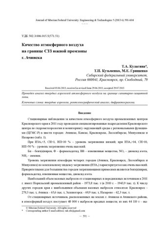 Библиографическое описание:Кулагина, Т. А. Качество атмосферного воздуха на границе СЗЗ южной промзоны г. Ачинска = Air Quality in the Industrial Zone of Southern Border SPZ Achinsk / Т. А. Кулагина, Т. Н. Кузьменко, М. Е. Грищенко. - Текст : непосредственный // Журнал Сибирского федерального университета. Техника и технологии. - 2013. - Т. 6, № 5. - С. 591-604 : рис., табл. - Библиогр.: с. 604. - ISSN 1999-494X.