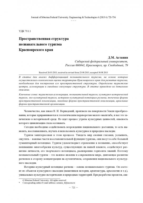 Библиографическое описание: Астанин, Д. М. Пространственная структура познавательного туризма Красноярского края / Д. М. Астанин. - Текст : непосредственный // Журнал Сибирского федерального университета. Техника и технологии. - 2013. - Т. 6, № 6. - С. 721-736 : рис., табл. - Библиогр.: с. 735. - ISSN 1999-494X.