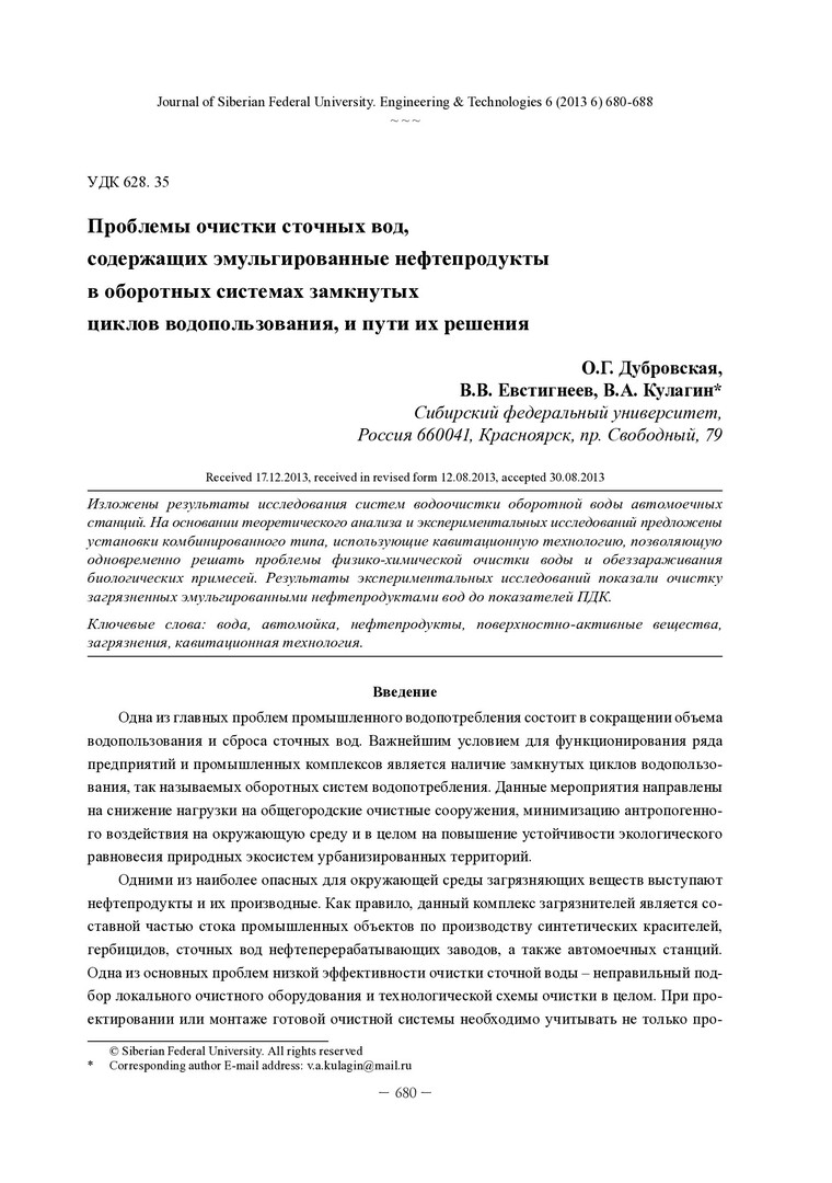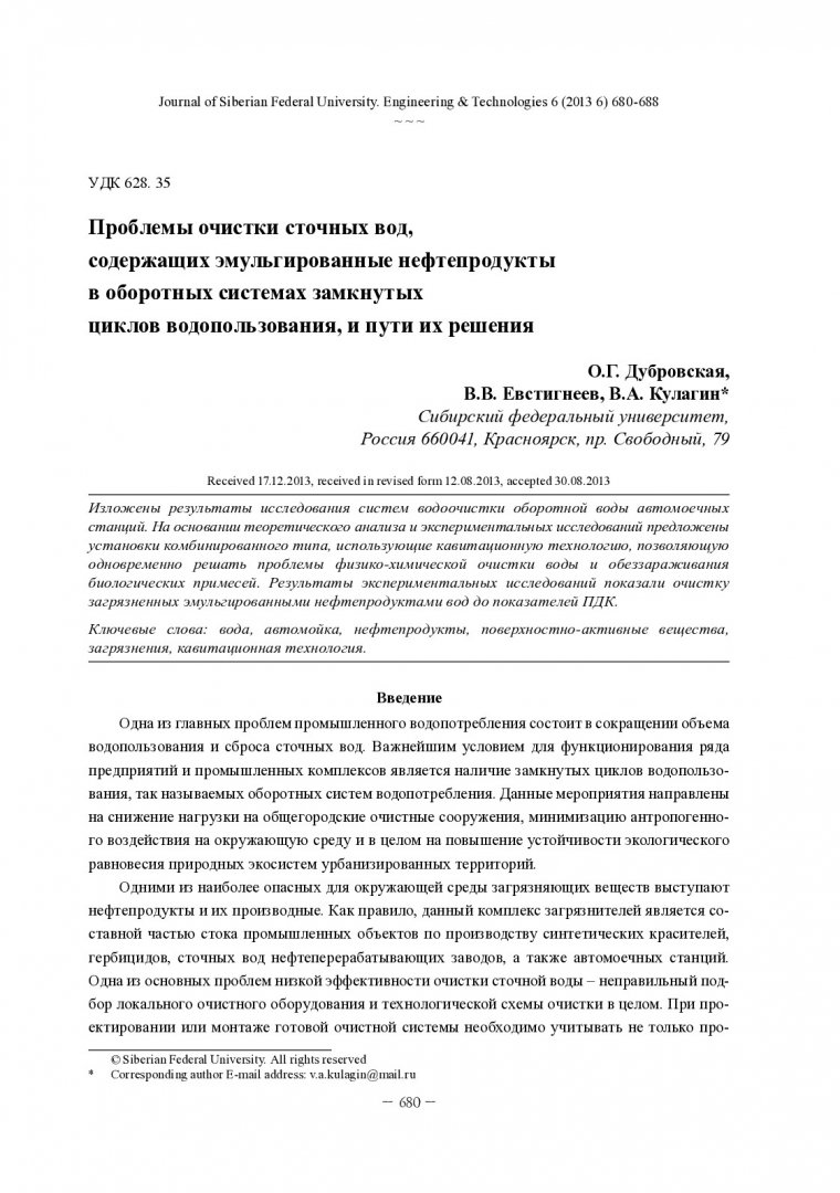 Библиографическое описание:Дубровская, О. Г. Проблемы очистки сточных вод, содержащих эмульгированные нефтепродукты в оборотных системах замкнутых циклов водопользования, и пути их решения / О. Г. Дубровская, В. В. Евстигнеев, В. А. Кулагин. - Текст : непосредственный // Журнал Сибирского федерального университета. Техника и технологии. - 2013. - Т. 6, № 6. - С. 680-688 : рис. - Библиогр.: с. 687-688. - ISSN 1999-494X.