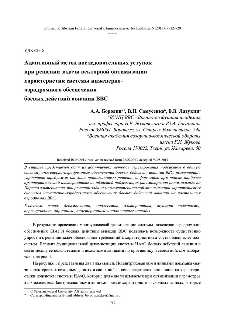 Аннотация:В статье представлен один из адаптивных методов агрегирования подсистем в единую систему инженерно-аэродромного обеспечения боевых действий авиации ВВС, позволяющий упростить требуемую от лица принимающего решение информацию при поиске наиболее предпочтительной альтернативы из областей подлежащих рассмотрению оптимальных по Парето альтернатив, при решении задачи многокритериальной оптимизации характеристик системы инженерно-аэродромного обеспечения боевых действий авиации на постоянных аэродромах ВВС.