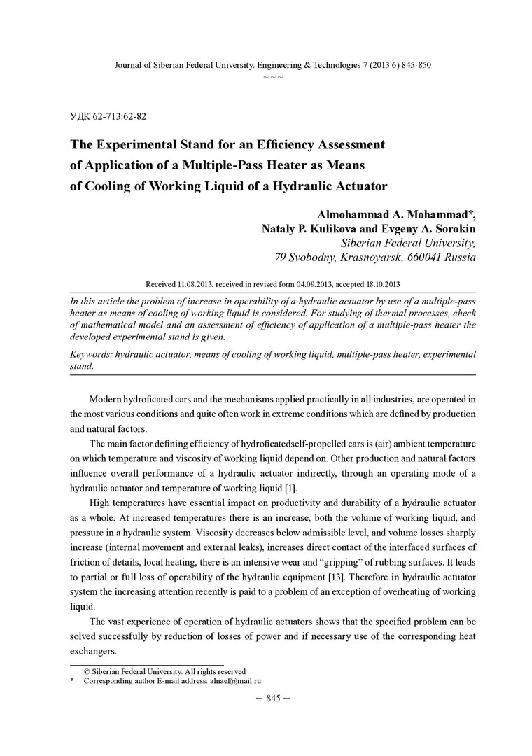 Библиографическое описание:Mohammad, Almohammad A... The Experimental Stand for an Efficiency Assessment of Application of a MultiplE-Pass Heater as Means of Cooling of Working Liquid of a HydrauliC Actuator = Экспериментальный стенд для оценки эффективности применения многоходового калорифера как средства охлаждения рабочей жидкости гидропривода / A. A. Mohammad, N. P. Kulikova, E. A. Sorokin. - Текст : непосредственный // Журнал Сибирского федерального университета. Техника и технологии. - 2013. - Т. 6, № 7. - С. 845-850 : рис., формулы. - Библиогр.: с. 849. - ISSN 1999-494X.